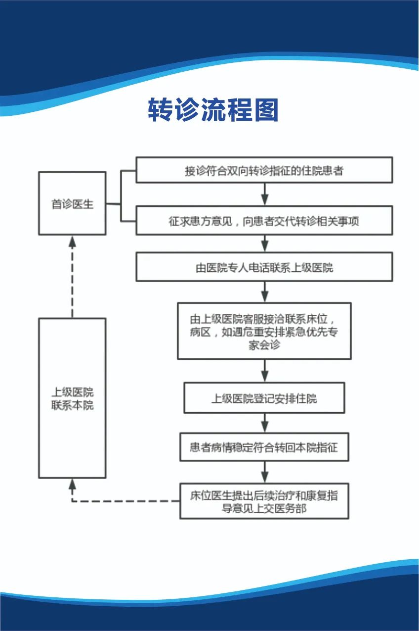 轉(zhuǎn)診服務(wù)內(nèi)容:在診治過程中需上級醫(yī)院進一步診治的轉(zhuǎn)診至上級醫(yī)院,對上轉(zhuǎn)后經(jīng)上級醫(yī)院治療后需轉(zhuǎn)回本院繼續(xù)治療的做好承接工作。