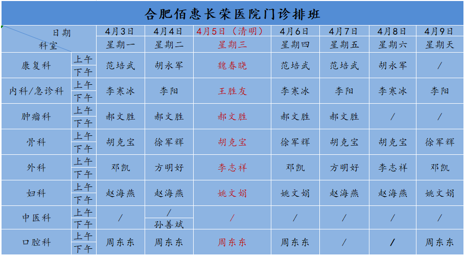佰惠就診丨4月3日-4月9日門診排班安排