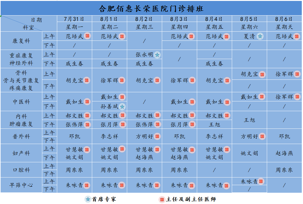 為方便廣大市民了解合肥佰惠長榮醫(yī)院門診醫(yī)師出診安排,現(xiàn)發(fā)布下周(7月31日-8月6日)門診醫(yī)師排班表,請大家合理安排就診時間。如遇停診、換診等特殊情況有所調(diào)整,以當(dāng)日出診安排為準(zhǔn),造成不便敬請諒解!