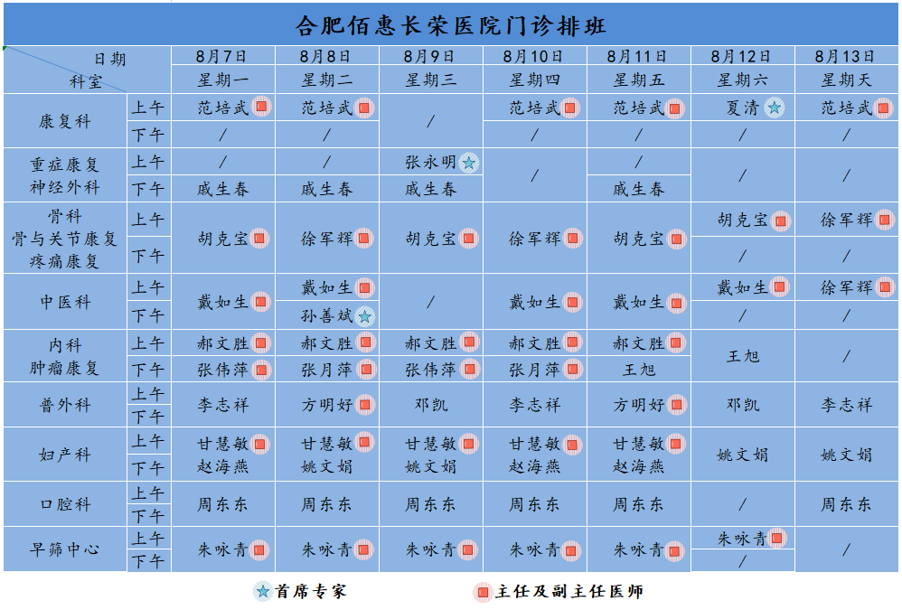 為方便廣大市民了解合肥佰惠長(zhǎng)榮醫(yī)院門診醫(yī)師出診安排,現(xiàn)發(fā)布下周(8月7日-8月13日)門診醫(yī)師排班表,請(qǐng)大家合理安排就診時(shí)間。如遇停診、換診等特殊情況有所調(diào)整,以當(dāng)日出診安排為準(zhǔn),造成不便敬請(qǐng)諒解!