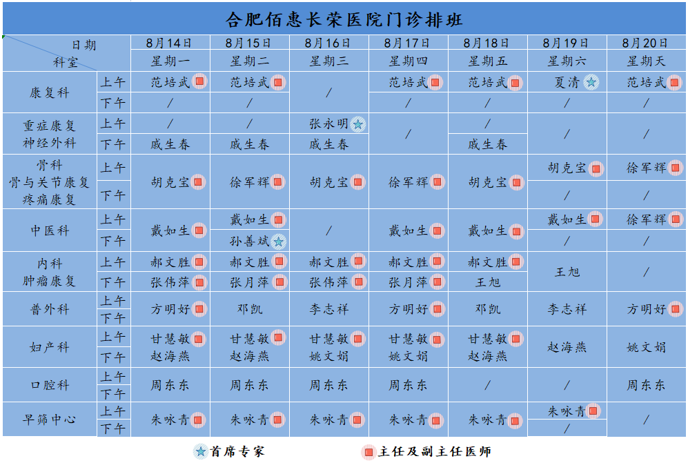 為方便廣大市民了解合肥佰惠長榮醫(yī)院門診醫(yī)師出診安排,現(xiàn)發(fā)布下周(8月14日-8月20日)門診醫(yī)師排班表,請大家合理安排就診時間。如遇停診、換診等特殊情況有所調(diào)整,以當(dāng)日出診安排為準(zhǔn),造成不便敬請諒解!