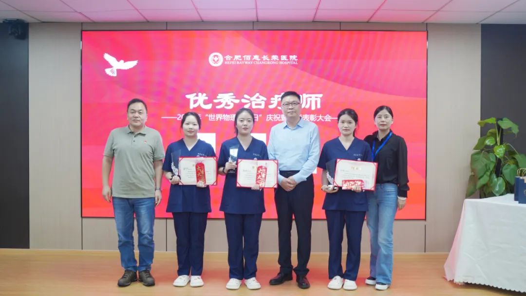 ▲佰澤醫(yī)療集團(tuán)副總裁、合肥佰惠長(zhǎng)榮醫(yī)院院長(zhǎng)盧繼忠,黨支部書記、副院長(zhǎng)張永恩,常務(wù)副院長(zhǎng)楊梅為“優(yōu)秀治療師”獎(jiǎng)獲得者余竹君、屈亞玲、鄧旭頒獎(jiǎng)