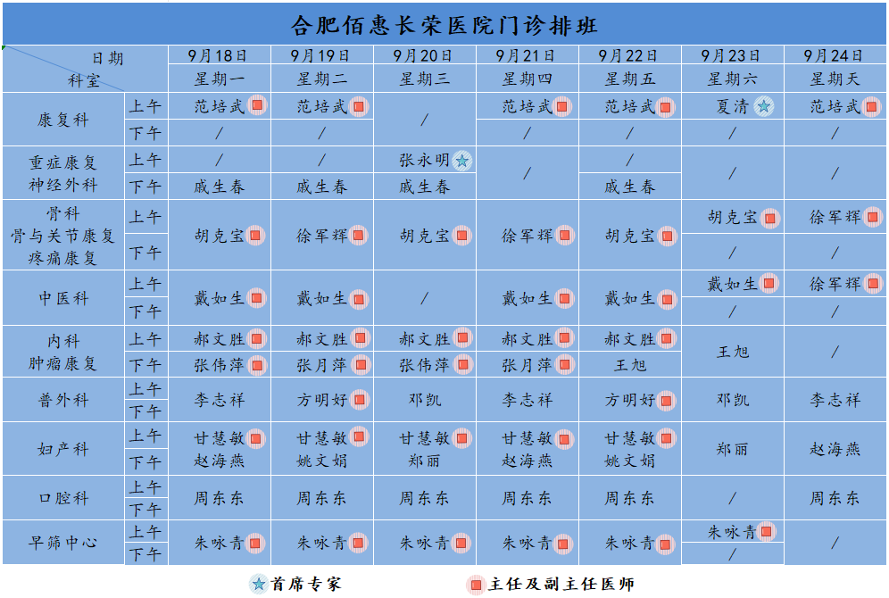 為方便廣大市民了解合肥佰惠長榮醫(yī)院門診醫(yī)師出診安排,現(xiàn)發(fā)布下周(9月18日-9月24日)門診醫(yī)師排班表,請大家合理安排就診時間。如遇停診、換診等特殊情況有所調(diào)整,以當(dāng)日出診安排為準(zhǔn),造成不便敬請諒解!