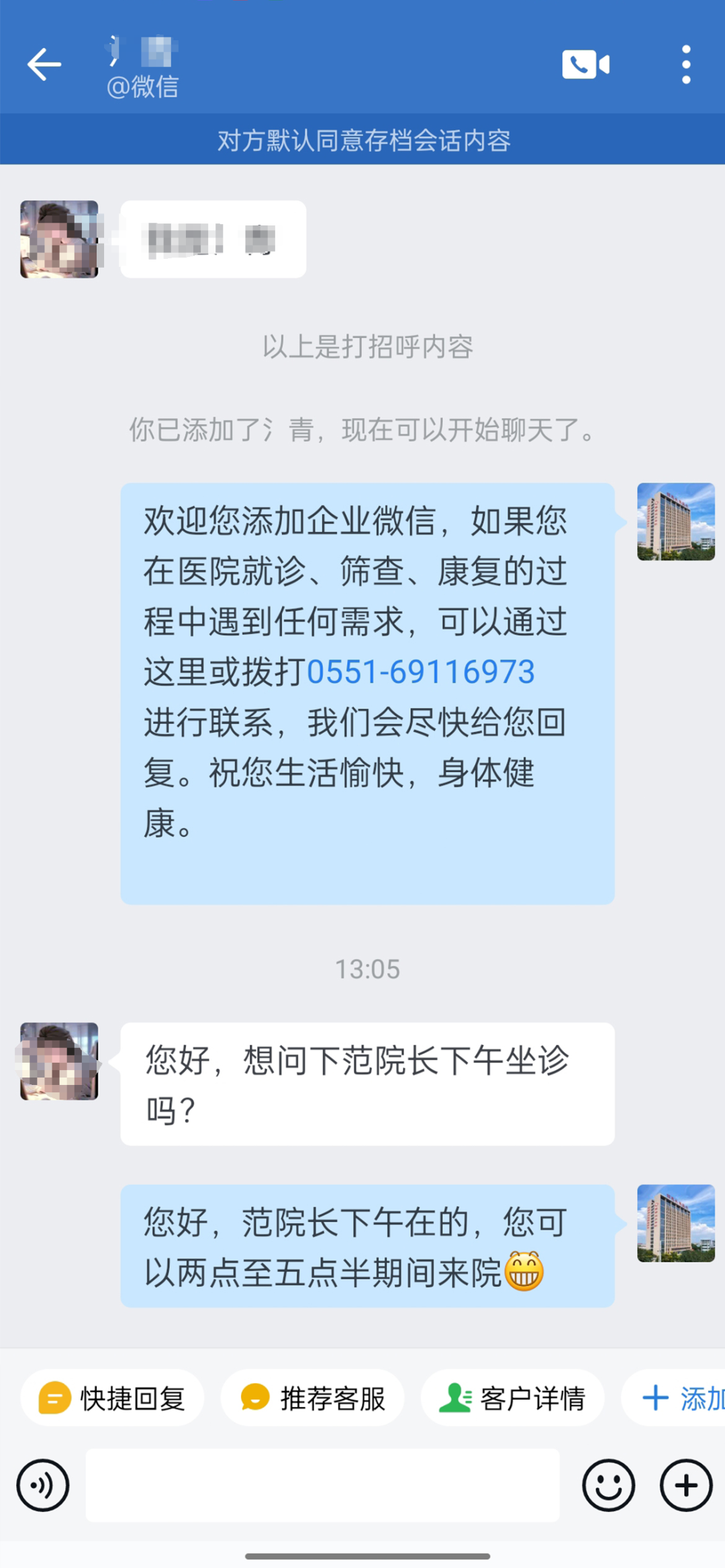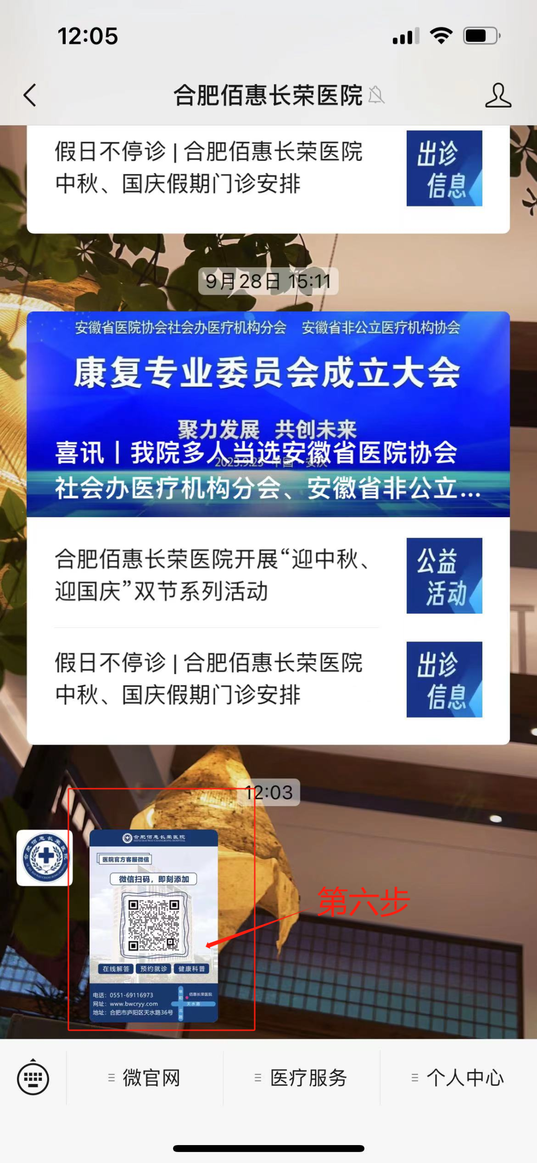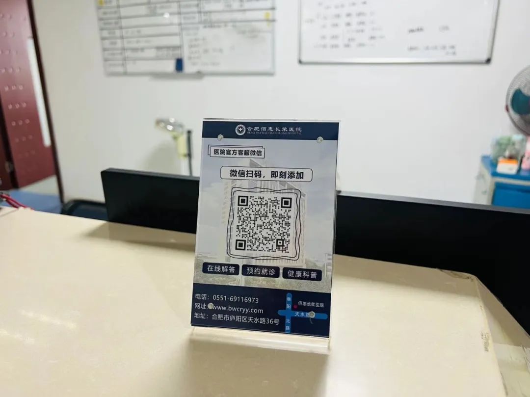 ②方式二:微信搜索“合肥佰惠長榮醫(yī)院”公眾號→【點(diǎn)擊關(guān)注進(jìn)入首頁】→【點(diǎn)擊“微官網(wǎng)”,再點(diǎn)擊“就診咨詢”】→【點(diǎn)開圖片,長按圖片識別二維碼】添加到微信通訊錄即可。③方式三:合肥佰惠長榮醫(yī)院院內(nèi)各處擺放的“佰惠健康管家”臺卡目前,我院已將“佰惠健康管家”微信二維碼的臺卡放置在了患者服務(wù)中心、門診、體檢中心、內(nèi)鏡中心、各病區(qū)護(hù)士站等地。大家可直接“微信掃描二維碼”進(jìn)行添加。