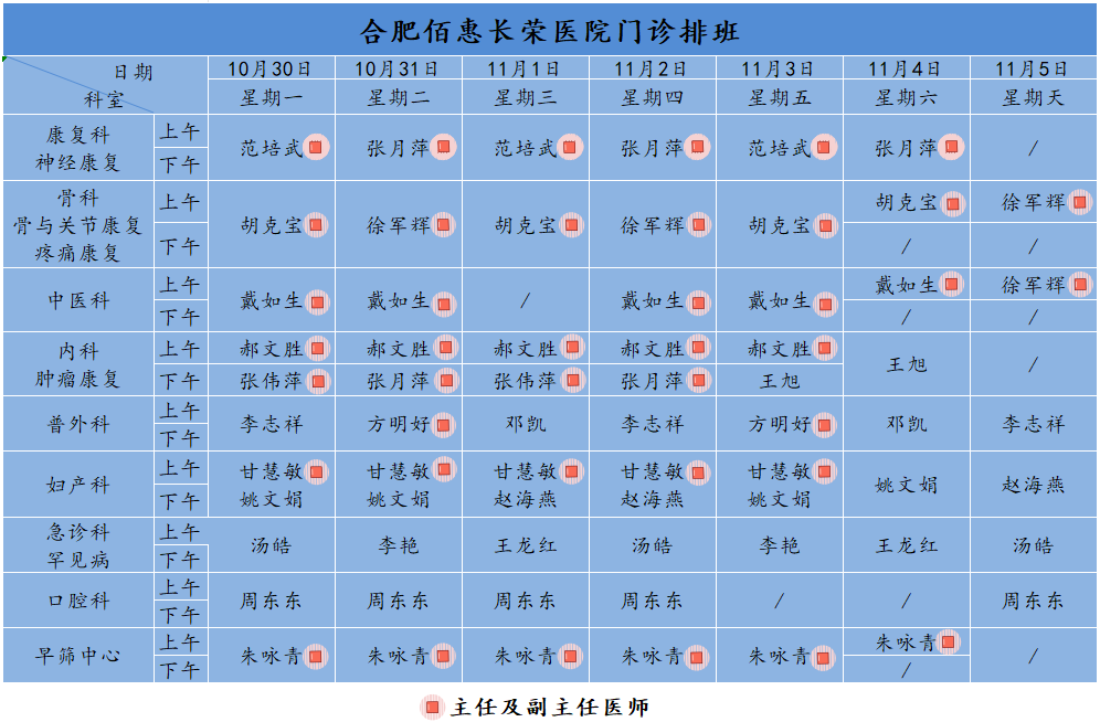 為方便廣大市民了解合肥佰惠長(zhǎng)榮醫(yī)院門診醫(yī)師出診安排,現(xiàn)發(fā)布下周(10月30日-11月5日)門診醫(yī)師排班表,請(qǐng)大家合理安排就診時(shí)間。如遇停診、換診等特殊情況有所調(diào)整,以當(dāng)日出診安排為準(zhǔn),造成不便敬請(qǐng)諒解!