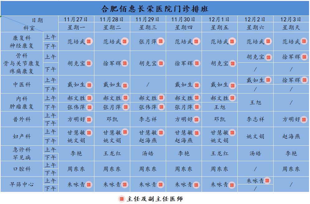 為方便廣大市民了解合肥佰惠長榮醫(yī)院門診醫(yī)師出診安排,現(xiàn)發(fā)布下周(11月27日-12月3日)門診醫(yī)師排班表,請大家合理安排就診時間。如遇停診、換診等特殊情況有所調(diào)整,以當日出診安排為準,造成不便敬請諒解!