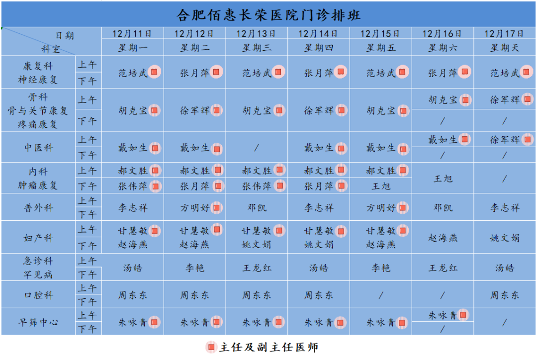 為方便廣大市民了解合肥佰惠長榮醫(yī)院門診醫(yī)師出診安排,現(xiàn)發(fā)布下周(12月11日-12月17日)門診醫(yī)師排班表,請大家合理安排就診時間。如遇停診、換診等特殊情況有所調(diào)整,以當(dāng)日出診安排為準(zhǔn),造成不便敬請諒解!
