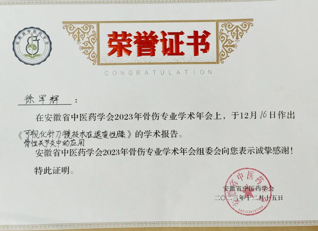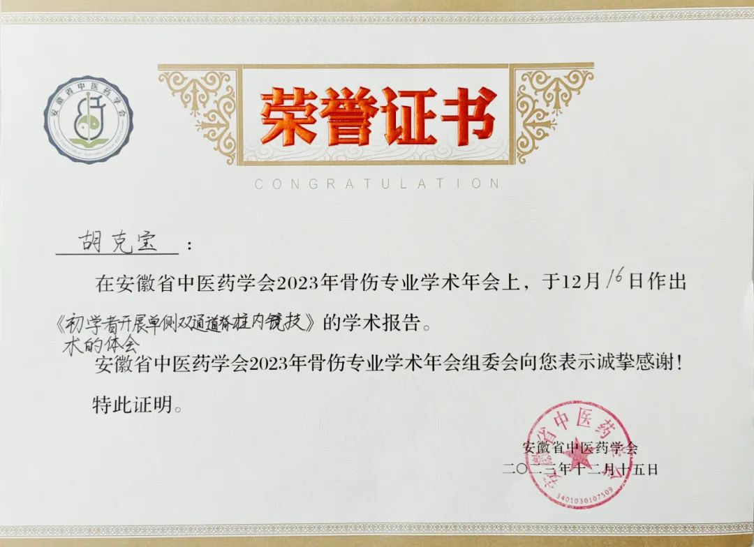 此外,我院骨科/骨科康復(fù)科主任胡克寶和副主任醫(yī)師徐軍輝于12月16日所作的《初學(xué)者開展單側(cè)雙通道脊柱內(nèi)鏡技術(shù)體會》和《可視化針刀鏡技術(shù)在退變性膝骨性關(guān)節(jié)炎中的應(yīng)用》學(xué)術(shù)報告受到了安徽省中醫(yī)藥學(xué)會2023年骨傷專業(yè)學(xué)術(shù)年會組委會的誠摯感謝,并授予了榮譽證書。