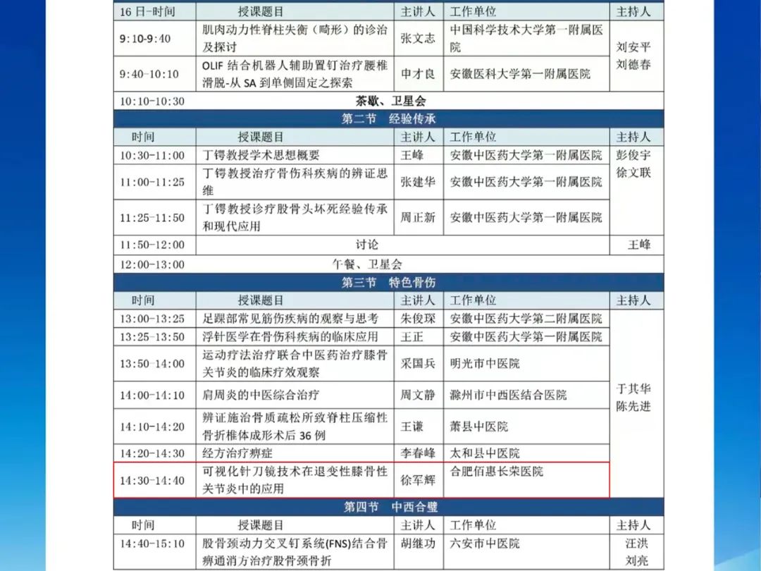 2023年12月15日至17日,由安徽中醫(yī)藥學(xué)會主辦、中醫(yī)藥學(xué)會骨傷分會和省中醫(yī)院承辦的安徽省中醫(yī)藥學(xué)會骨傷專業(yè)委員會第十三屆(2023年)學(xué)術(shù)會議將在合肥舉行。合肥佰惠長榮醫(yī)院骨科/骨科康復(fù)科主任胡克寶及副主任醫(yī)師徐軍輝受邀出席,并與省內(nèi)其他骨傷領(lǐng)域的專家學(xué)者一同參與討論與研究。大會旨在進一步總結(jié)推廣中西醫(yī)診治骨傷疾病的臨床經(jīng)驗和學(xué)術(shù)成果,促進我省中醫(yī)骨傷學(xué)科發(fā)展。
