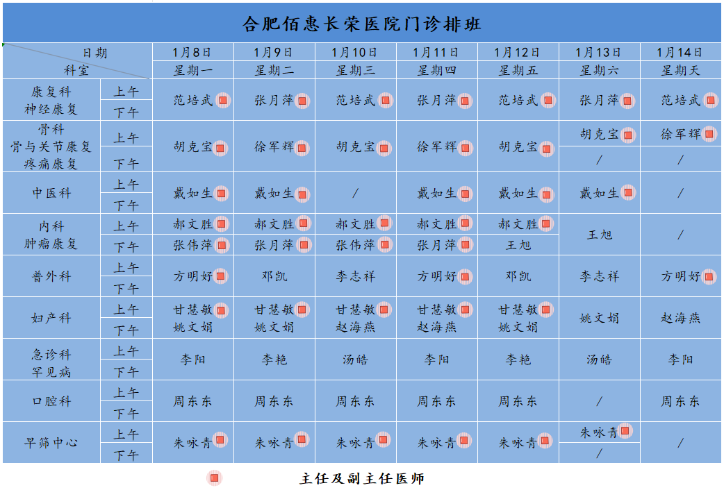 為方便廣大市民了解合肥佰惠長榮醫(yī)院門診醫(yī)師出診安排,現(xiàn)發(fā)布下周(1月8日-1月14日)門診醫(yī)師排班表,請大家合理安排就診時間。如遇停診、換診等特殊情況有所調(diào)整,以當日出診安排為準,造成不便敬請諒解!