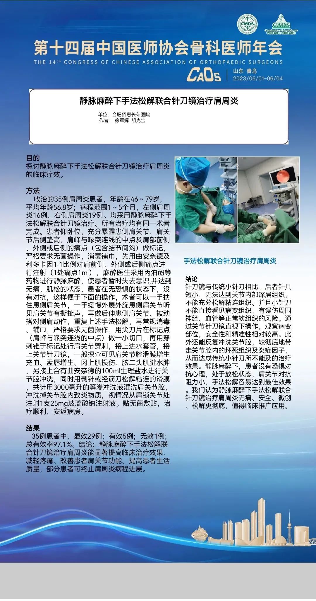 由我院骨科主任胡克寶、副主任醫(yī)師徐軍輝共同撰寫的多篇論文均被中華醫(yī)學(xué)會疼痛學(xué)分會第十九屆學(xué)術(shù)年會選中,屆時將以大會發(fā)言交流和電子壁報交流的形式在全國疼痛年會上展示。
