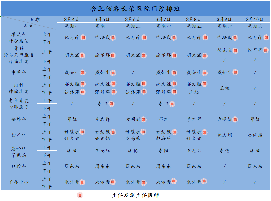 為方便廣大市民了解合肥佰惠長榮醫(yī)院門診醫(yī)師出診安排,現(xiàn)發(fā)布下周(3月4日-3月10日)門診醫(yī)師排班表,請大家合理安排就診時間。如遇停診、換診等特殊情況有所調(diào)整,以當(dāng)日出診安排為準(zhǔn),造成不便敬請諒解!