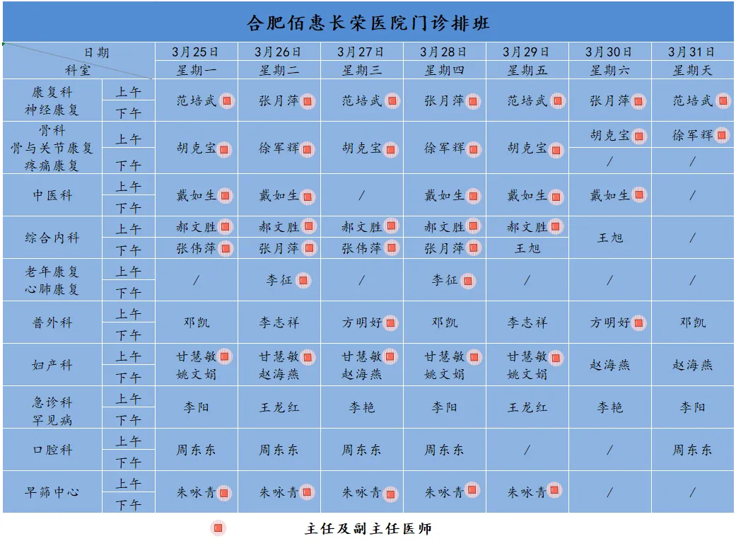 為方便廣大市民了解合肥佰惠長(zhǎng)榮醫(yī)院門診醫(yī)師出診安排,現(xiàn)發(fā)布下周(3月25日-3月31日)門診醫(yī)師排班表,請(qǐng)大家合理安排就診時(shí)間。如遇停診、換診等特殊情況有所調(diào)整,以當(dāng)日出診安排為準(zhǔn),造成不便敬請(qǐng)諒解!