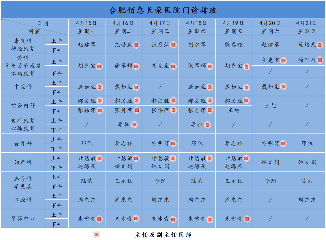 為方便廣大市民了解合肥佰惠長榮醫(yī)院門診醫(yī)師出診安排,現(xiàn)發(fā)布下周(4月15日-4月21日)門診醫(yī)師排班表,請大家合理安排就診時間。如遇停診、換診等特殊情況有所調(diào)整,以當(dāng)日出診安排為準(zhǔn),造成不便敬請諒解!