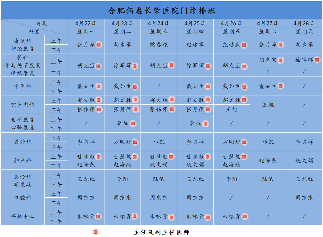 為方便廣大市民了解合肥佰惠長榮醫(yī)院門診醫(yī)師出診安排,現(xiàn)發(fā)布下周(4月22日-4月28日)門診醫(yī)師排班表,請大家合理安排就診時間。如遇停診、換診等特殊情況有所調(diào)整,以當(dāng)日出診安排為準(zhǔn),造成不便敬請諒解!