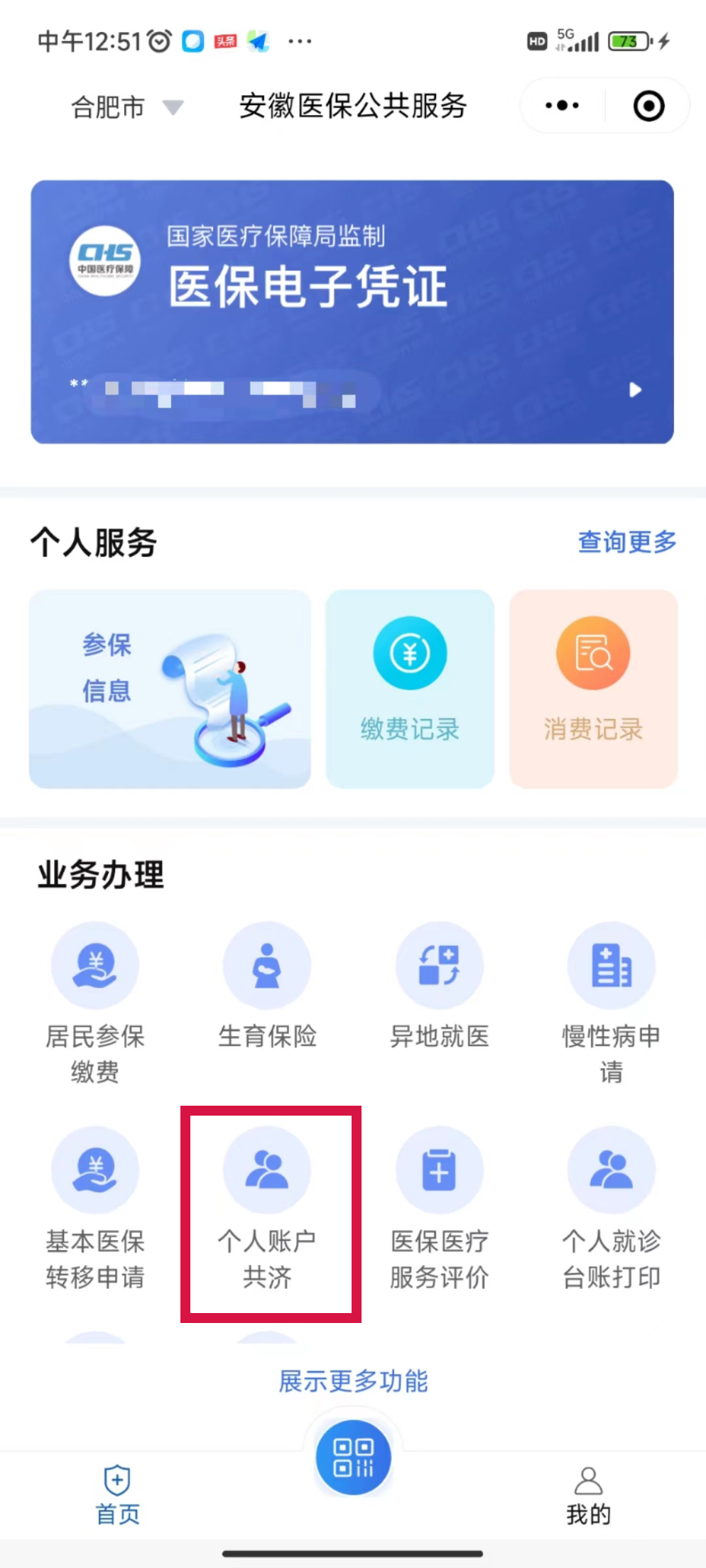 第一步:職工醫(yī)保參保人在“合肥醫(yī)?!惫娞?hào)點(diǎn)擊【服務(wù)大廳】進(jìn)入“安徽醫(yī)保公共服務(wù)”小程序,選擇左上角本人職工醫(yī)保的【參保地】,點(diǎn)擊“個(gè)人賬戶共濟(jì)綁定”。