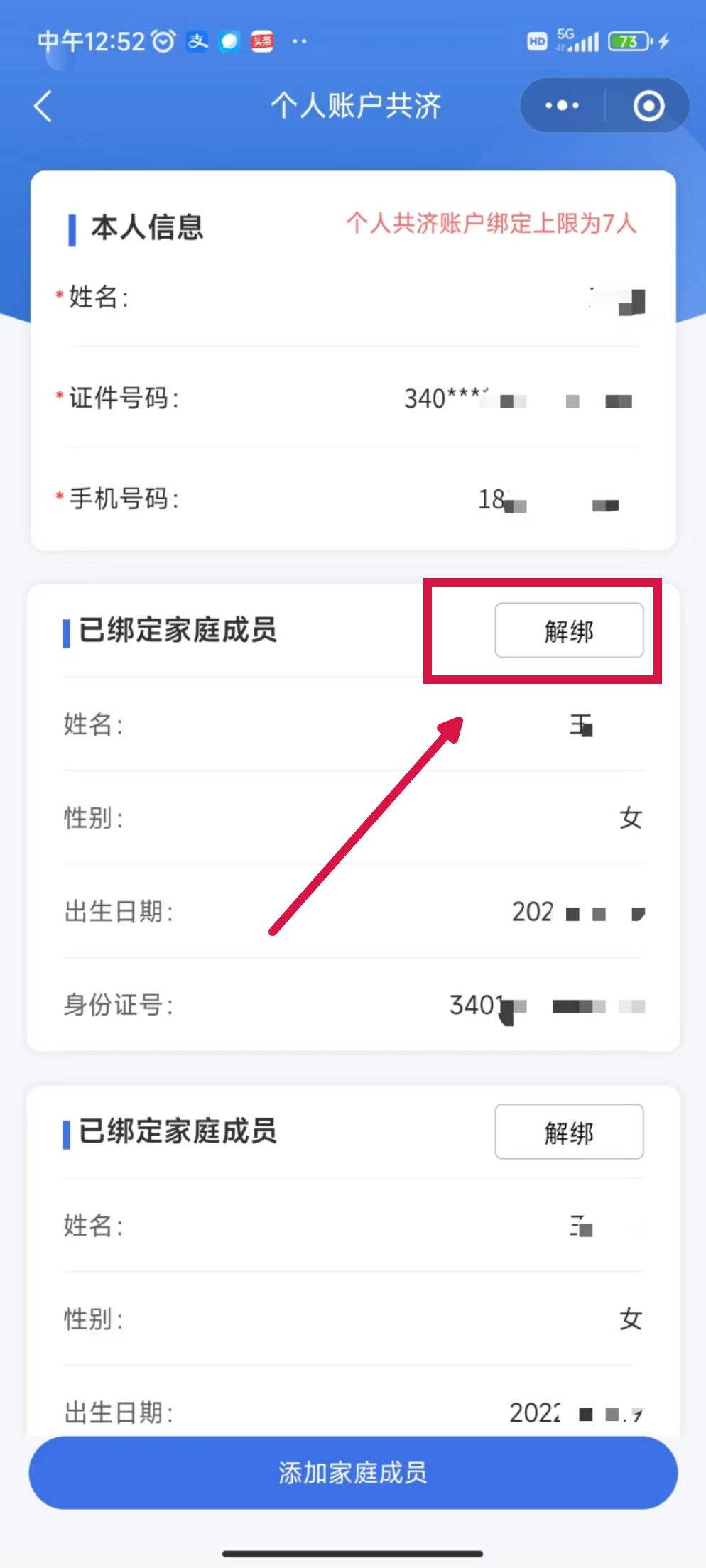 第二步:在“已綁定家庭成員”中,選擇需要解綁的成員,點(diǎn)擊“解綁”,即可完成原被綁定人的綁定關(guān)系解除。