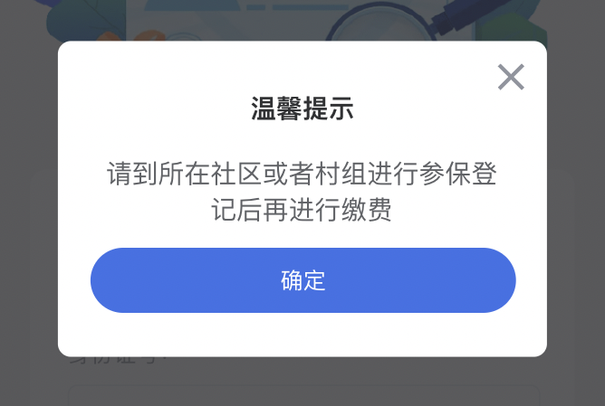 繳費(fèi)時(shí)如果遇到下圖提示,請(qǐng)到社區(qū)或者村組參保繳費(fèi)窗口進(jìn)行參保登記。