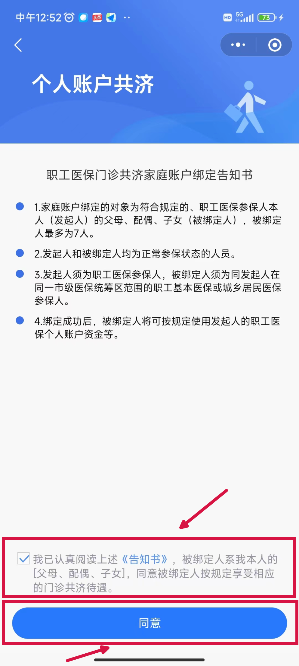 第二步:界面彈出《職工醫(yī)保門(mén)診共濟(jì)家庭賬戶綁定告知書(shū)》,請(qǐng)認(rèn)真閱讀后,在方框格中點(diǎn)擊勾選,再點(diǎn)擊【同意】,進(jìn)入下一界面。