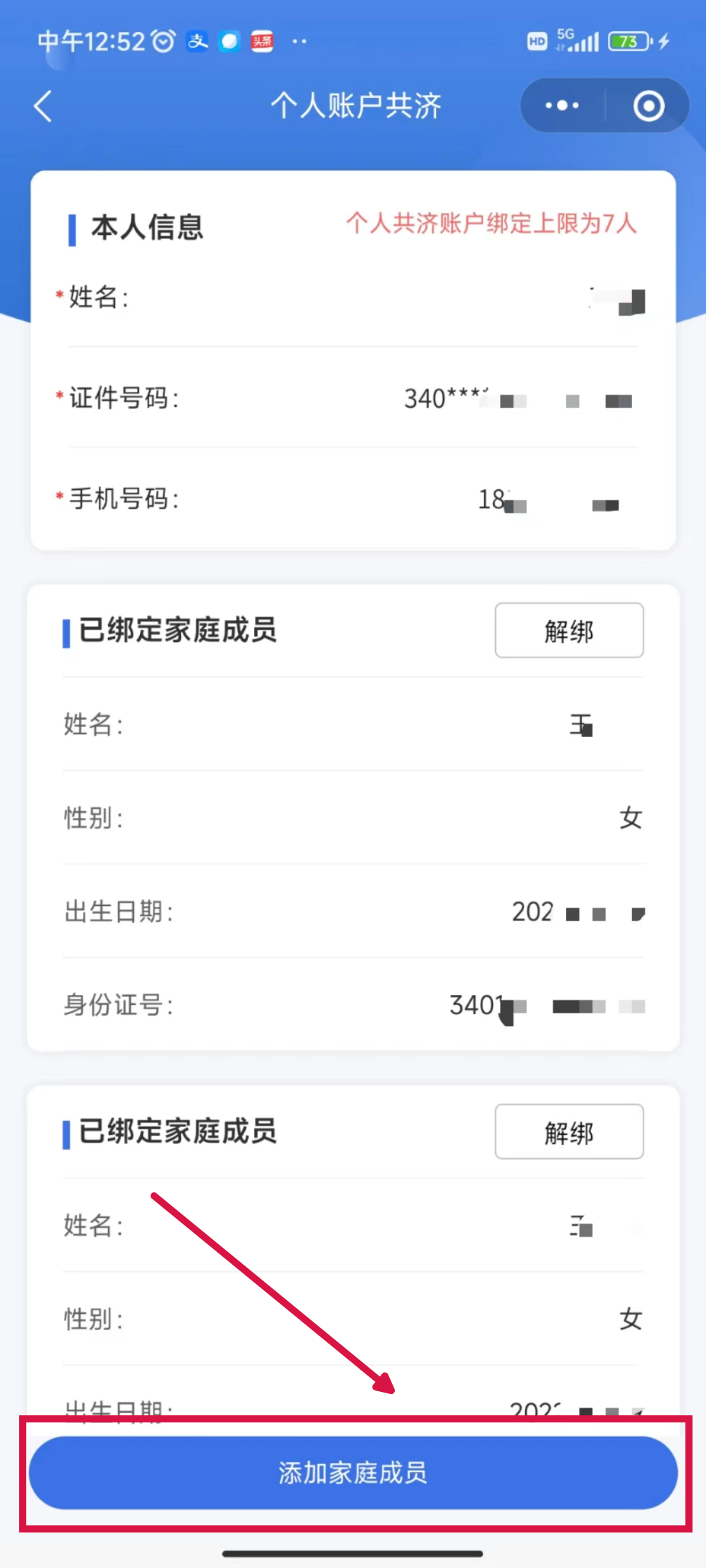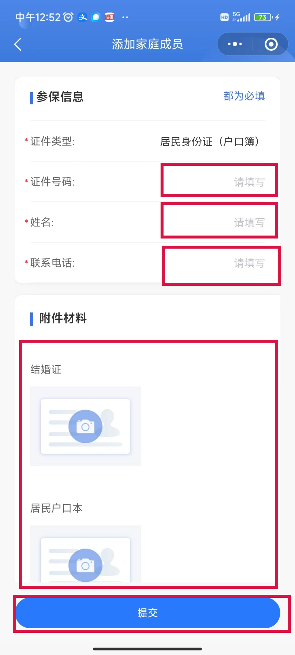 第三步:在界面點(diǎn)擊【添加家庭成員】,彈出界面,輸入配偶、父母、子女的證件號(hào)碼、聯(lián)系電話(系統(tǒng)自動(dòng)查詢?cè)撟C件號(hào)碼對(duì)應(yīng)的參保人姓名),上傳結(jié)婚證、居民戶口簿等證明資料,核對(duì)無(wú)誤后,點(diǎn)擊【提交】,完成綁定。