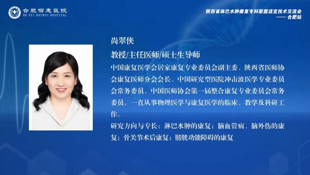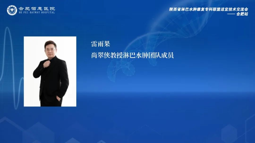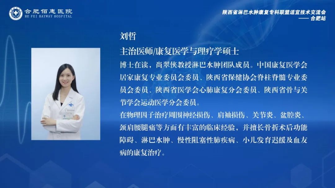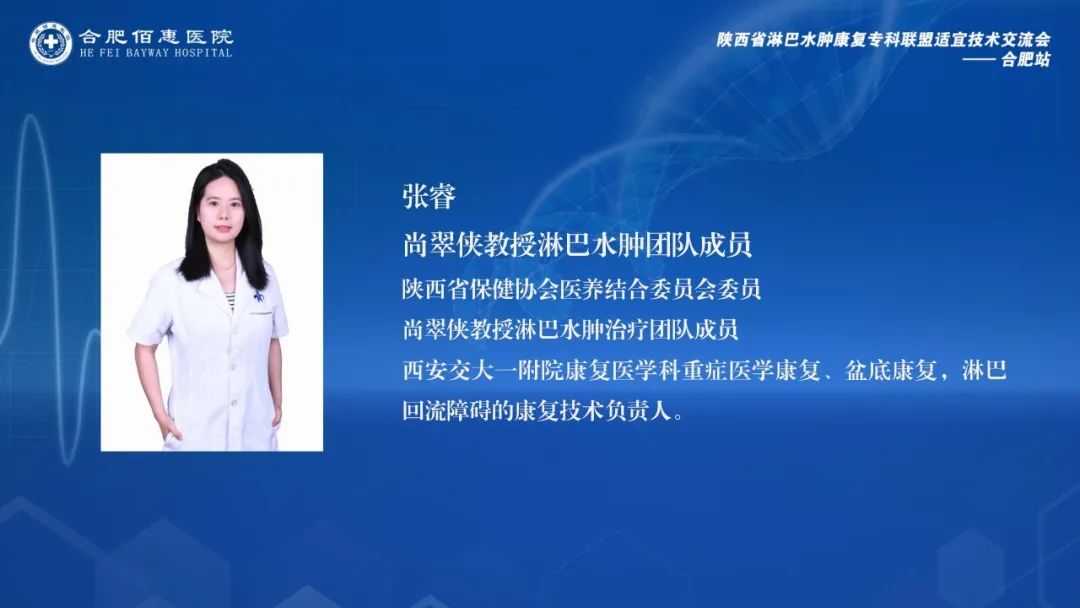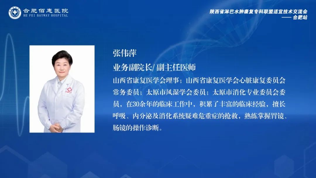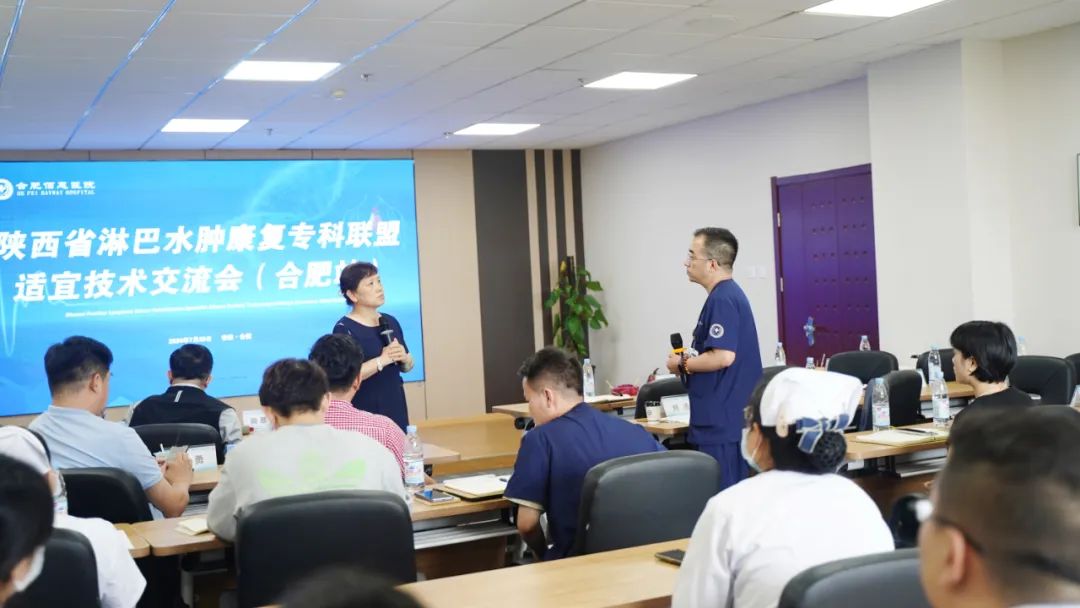 會議邀請了陜西省淋巴水腫康復專科聯(lián)盟的多位資深專家,包括西安交通大學第一附屬醫(yī)院康復醫(yī)學科尚翠俠教授、劉哲博士、張睿治療師、雷雨果助理,以及深圳大學第一附屬醫(yī)院南澳康復分院疼痛康復科王季教授。這些專家的參與,為會議帶來了豐富的學術資源和實踐經驗。同時,合肥佰惠醫(yī)院業(yè)務副院長張偉萍、副院長范培武、醫(yī)務部主任張月萍以及相關科室的主任、治療師和護士團隊也積極參與其中,共同探討和學習淋巴水腫治療的前沿技術和實踐經驗。