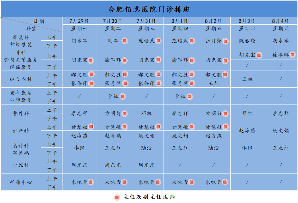為方便廣大市民了解合肥佰惠醫(yī)院門診醫(yī)師出診安排,現(xiàn)發(fā)布下周(7月29日-8月4日)門診醫(yī)師排班表,請(qǐng)大家合理安排就診時(shí)間。如遇停診、換診等特殊情況有所調(diào)整,以當(dāng)日出診安排為準(zhǔn),造成不便敬請(qǐng)諒解!