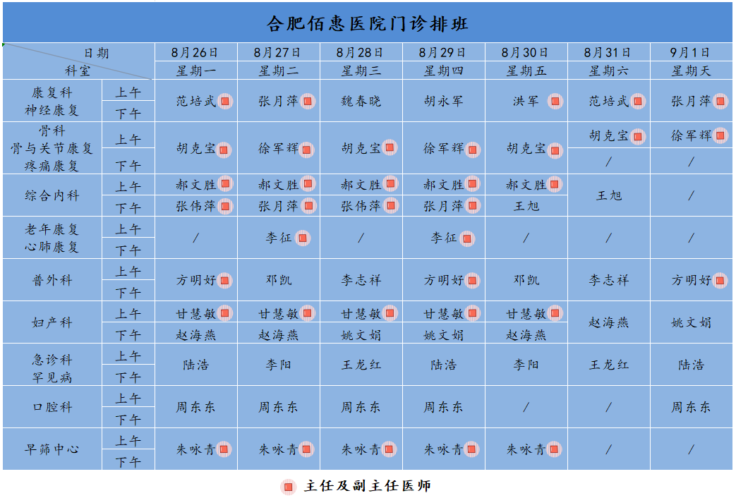 為方便廣大市民了解合肥佰惠醫(yī)院門診醫(yī)師出診安排,現(xiàn)發(fā)布下周(8月26日-9月1日)門診醫(yī)師排班表,請(qǐng)大家合理安排就診時(shí)間。如遇停診、換診等特殊情況有所調(diào)整,以當(dāng)日出診安排為準(zhǔn),造成不便敬請(qǐng)諒解!