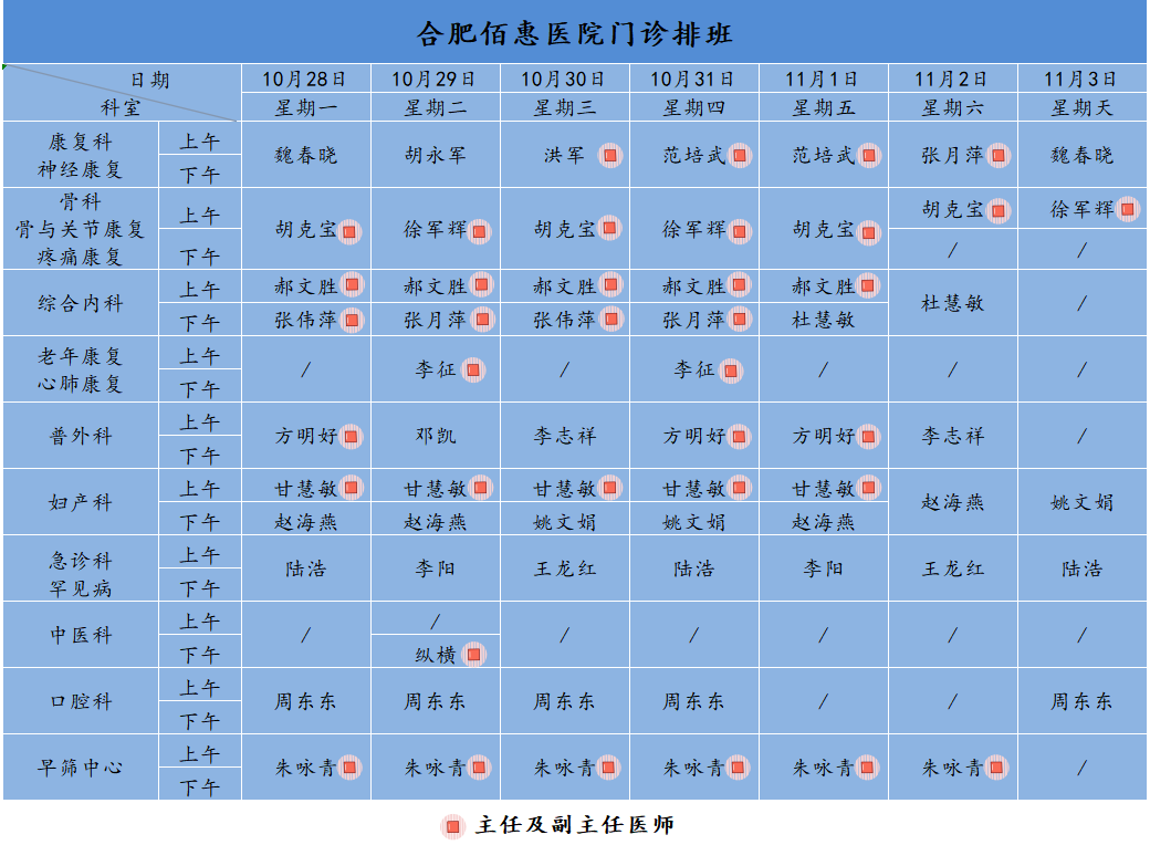 為方便廣大市民了解合肥佰惠醫(yī)院門診醫(yī)師出診安排,現(xiàn)發(fā)布下周(10月28日-11月3日)門診醫(yī)師排班表,請(qǐng)大家合理安排就診時(shí)間。如遇停診、換診等特殊情況有所調(diào)整,以當(dāng)日出診安排為準(zhǔn),造成不便敬請(qǐng)諒解!