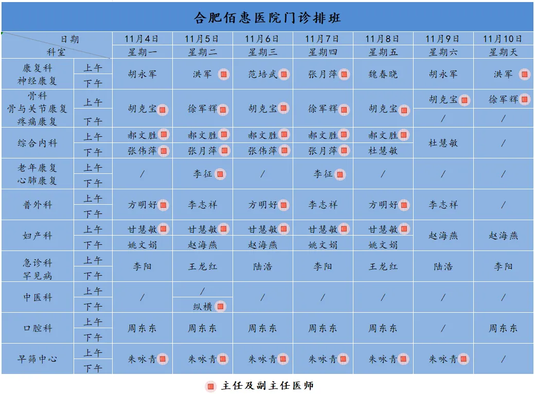 為方便廣大市民了解合肥佰惠醫(yī)院門診醫(yī)師出診安排,現(xiàn)發(fā)布下周(11月4日-11月10日)門診醫(yī)師排班表,請大家合理安排就診時(shí)間。如遇停診、換診等特殊情況有所調(diào)整,以當(dāng)日出診安排為準(zhǔn),造成不便敬請諒解!