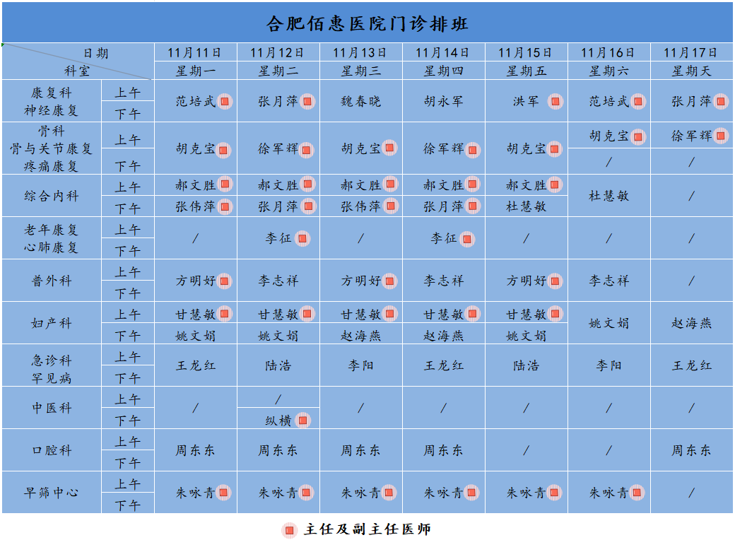 為方便廣大市民了解合肥佰惠醫(yī)院門診醫(yī)師出診安排,現(xiàn)發(fā)布下周(11月11日-11月17日)門診醫(yī)師排班表,請大家合理安排就診時間。如遇停診、換診等特殊情況有所調(diào)整,以當(dāng)日出診安排為準(zhǔn),造成不便敬請諒解!