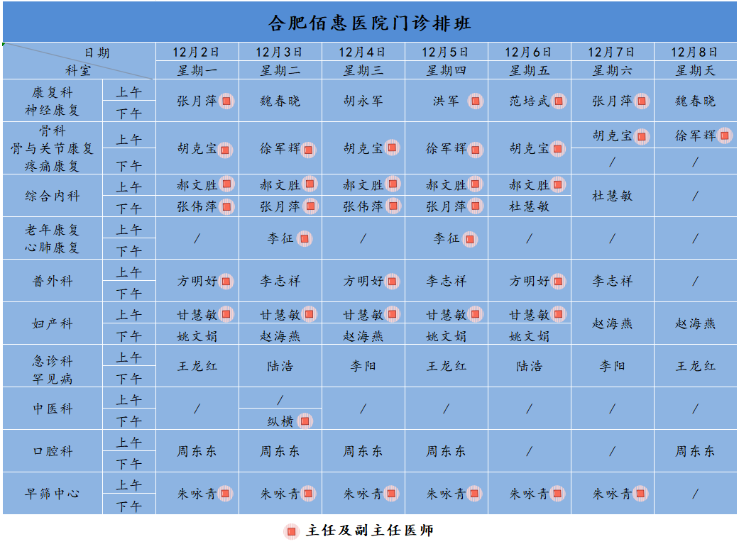 為方便廣大市民了解合肥佰惠醫(yī)院門診醫(yī)師出診安排,現(xiàn)發(fā)布下周(12月2日-12月8日)門診醫(yī)師排班表,請(qǐng)大家合理安排就診時(shí)間。如遇停診、換診等特殊情況有所調(diào)整,以當(dāng)日出診安排為準(zhǔn),造成不便敬請(qǐng)諒解!
