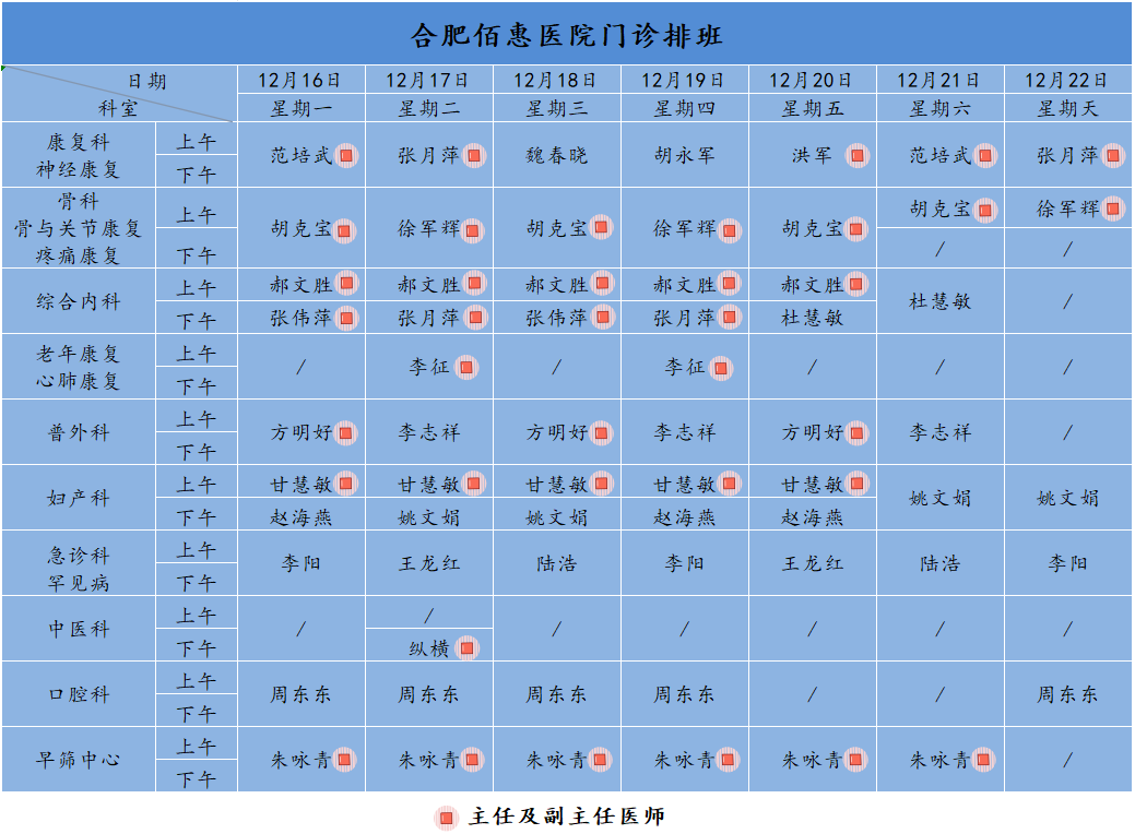 為方便廣大市民了解合肥佰惠醫(yī)院門診醫(yī)師出診安排,現(xiàn)發(fā)布下周(12月16日-12月22日)門診醫(yī)師排班表,請大家合理安排就診時間。如遇停診、換診等特殊情況有所調整,以當日出診安排為準,造成不便敬請諒解!