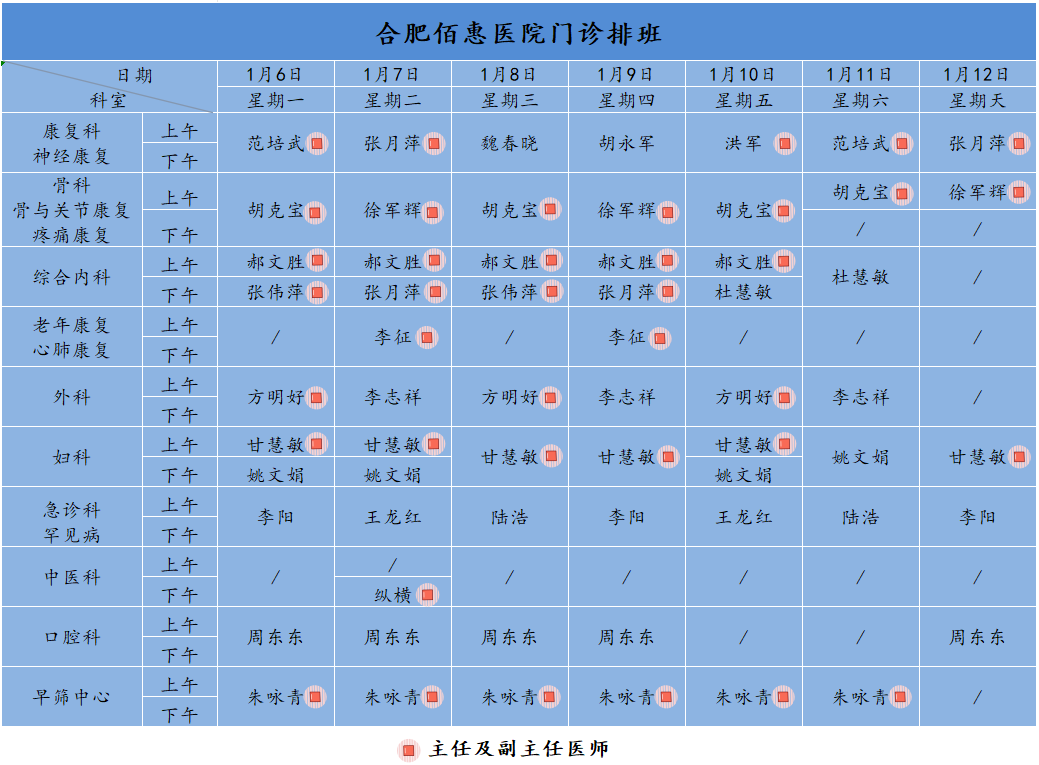 為方便廣大市民了解合肥佰惠醫(yī)院門診醫(yī)師出診安排,現(xiàn)發(fā)布下周(1月6日-1月12日)門診醫(yī)師排班表,請(qǐng)大家合理安排就診時(shí)間。如遇停診、換診等特殊情況有所調(diào)整,以當(dāng)日出診安排為準(zhǔn),造成不便敬請(qǐng)諒解!