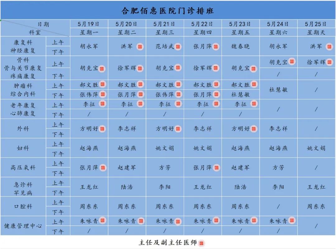 為方便廣大市民了解合肥佰惠醫(yī)院門診醫(yī)師出診安排,現發(fā)布下周(5月19日-5月25日)門診醫(yī)師排班表,請大家合理安排就診時間。如遇停診、換診等特殊情況有所調整,以當日出診安排為準,造成不便敬請諒解!