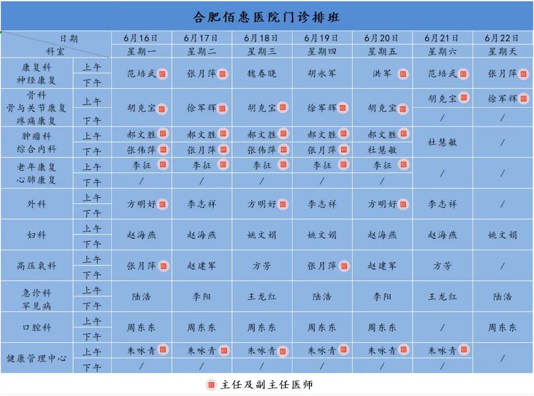 為方便廣大市民了解合肥佰惠醫(yī)院門診醫(yī)師出診安排,現(xiàn)發(fā)布下周(6月16日-6月22日)門診醫(yī)師排班表,請大家合理安排就診時間。如遇停診、換診等特殊情況有所調整,以當日出診安排為準,造成不便敬請諒解!