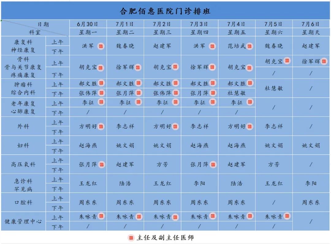 為方便廣大市民了解合肥佰惠醫(yī)院門診醫(yī)師出診安排,現(xiàn)發(fā)布下周(6月30日-7月6日)門診醫(yī)師排班表,請(qǐng)大家合理安排就診時(shí)間。如遇停診、換診等特殊情況有所調(diào)整,以當(dāng)日出診安排為準(zhǔn),造成不便敬請(qǐng)諒解!