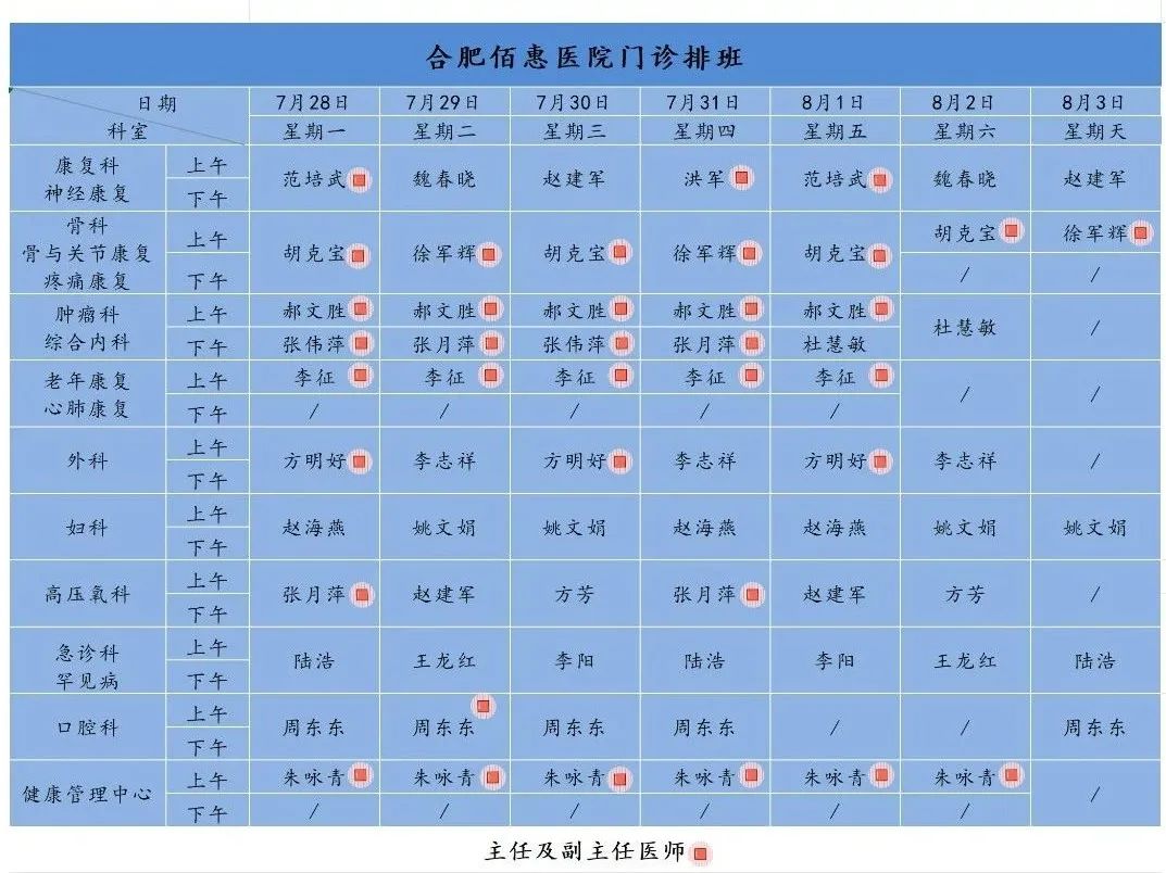 為方便廣大市民了解合肥佰惠醫(yī)院門診醫(yī)師出診安排,現(xiàn)發(fā)布本周(7月28日-8月3日)門診醫(yī)師排班表,請(qǐng)大家合理安排就診時(shí)間。如遇停診、換診等特殊情況有所調(diào)整,以當(dāng)日出診安排為準(zhǔn),造成不便敬請(qǐng)諒解!