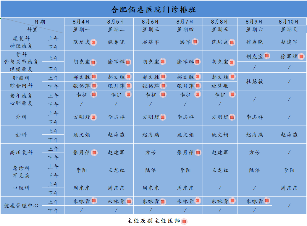 為方便廣大市民了解合肥佰惠醫(yī)院門診醫(yī)師出診安排,現(xiàn)發(fā)布本周(8月4日-8月10日)門診醫(yī)師排班表,請大家合理安排就診時間。如遇停診、換診等特殊情況有所調(diào)整,以當日出診安排為準,造成不便敬請諒解!