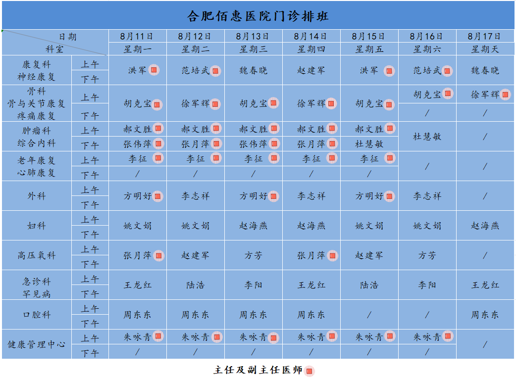 為方便廣大市民了解合肥佰惠醫(yī)院門診醫(yī)師出診安排,現(xiàn)發(fā)布本周(8月11日-8月17日)門診醫(yī)師排班表,請(qǐng)大家合理安排就診時(shí)間。如遇停診、換診等特殊情況有所調(diào)整,以當(dāng)日出診安排為準(zhǔn),造成不便敬請(qǐng)諒解!