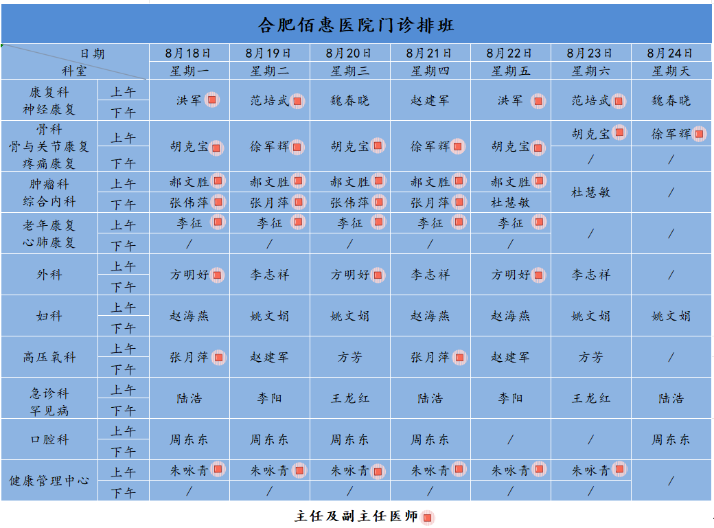 為方便廣大市民了解合肥佰惠醫(yī)院門診醫(yī)師出診安排,現(xiàn)發(fā)布本周(8月18日-8月24日)門診醫(yī)師排班表,請(qǐng)大家合理安排就診時(shí)間。如遇停診、換診等特殊情況有所調(diào)整,以當(dāng)日出診安排為準(zhǔn),造成不便敬請(qǐng)諒解!