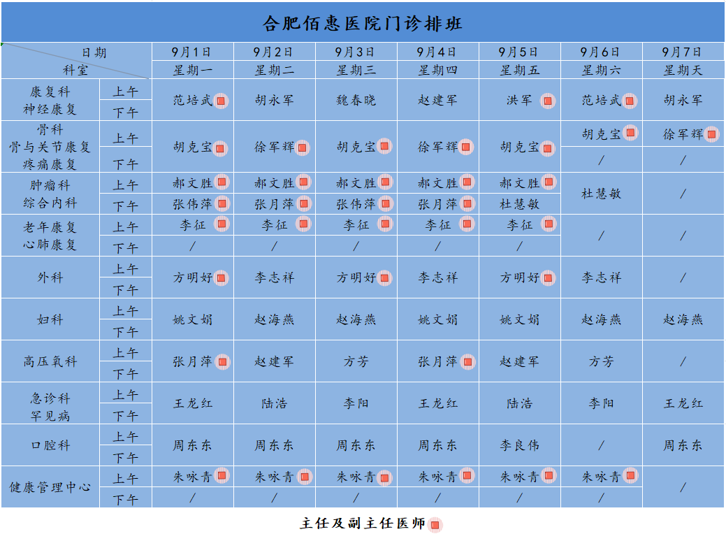 為方便廣大市民了解合肥佰惠醫(yī)院門診醫(yī)師出診安排,現(xiàn)發(fā)布本周(9月1日-9月7日)門診醫(yī)師排班表,請(qǐng)大家合理安排就診時(shí)間。如遇停診、換診等特殊情況有所調(diào)整,以當(dāng)日出診安排為準(zhǔn),造成不便敬請(qǐng)諒解!