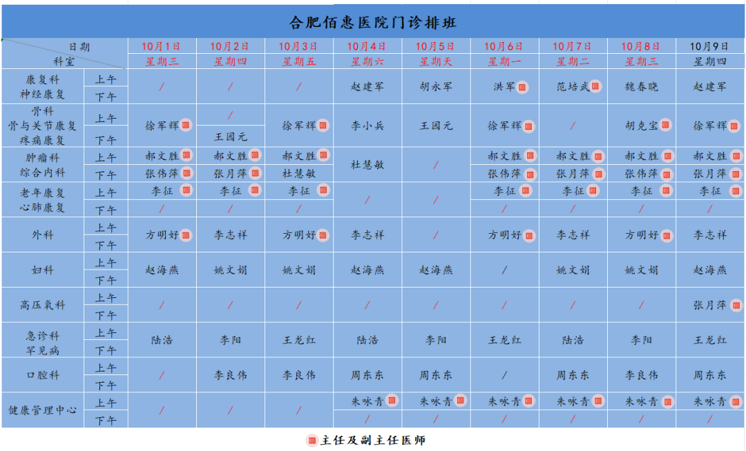 為方便廣大市民了解合肥佰惠醫(yī)院門診醫(yī)師出診安排,現(xiàn)發(fā)布國(guó)慶假期(10月1日-10月9日)門診醫(yī)師排班表,請(qǐng)大家合理安排就診時(shí)間。如遇停診、換診等特殊情況有所調(diào)整,以當(dāng)日出診安排為準(zhǔn),造成不便敬請(qǐng)諒解!