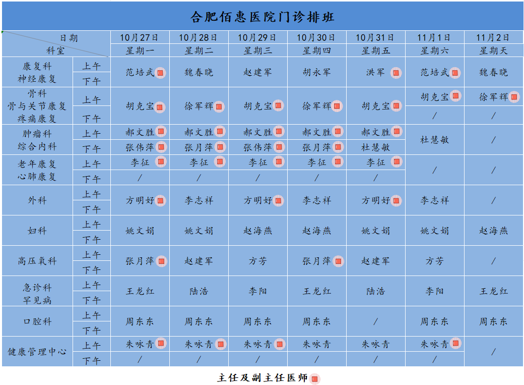 為方便廣大市民了解合肥佰惠醫(yī)院門診醫(yī)師出診安排,現(xiàn)發(fā)布本周(10月27日-11月2日)門診醫(yī)師排班表,請大家合理安排就診時間。如遇停診、換診等特殊情況有所調(diào)整,以當(dāng)日出診安排為準(zhǔn),造成不便敬請諒解!