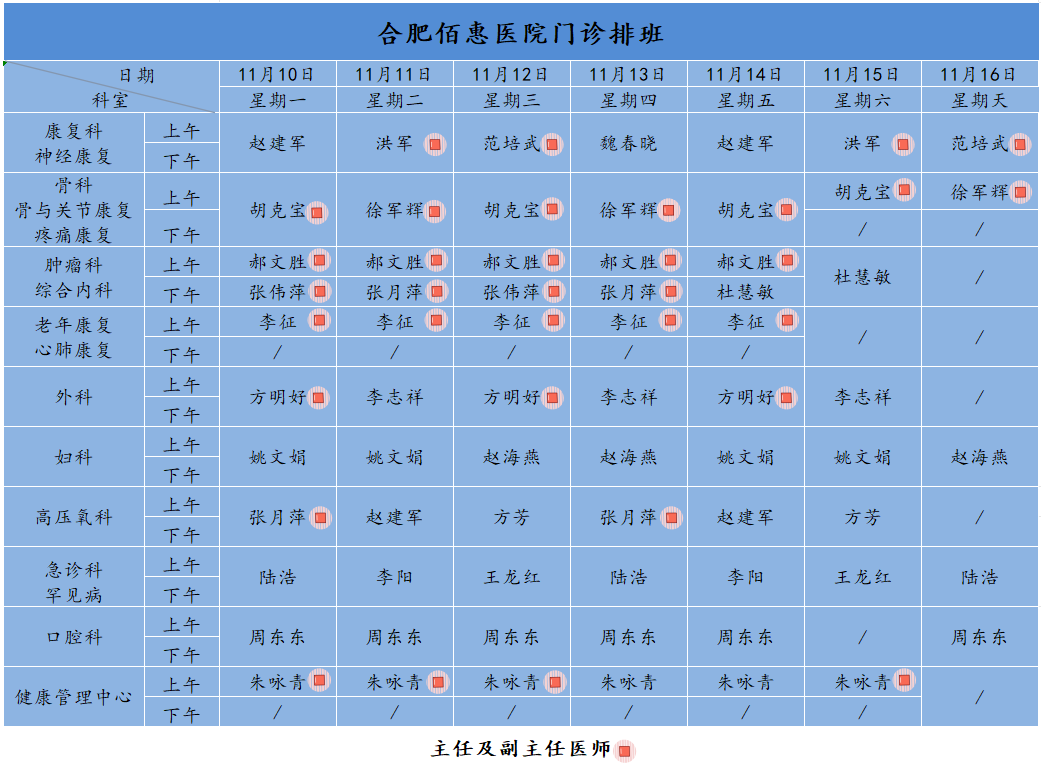 為方便廣大市民了解合肥佰惠醫(yī)院門診醫(yī)師出診安排,現(xiàn)發(fā)布本周(11月10日-11月16日)門診醫(yī)師排班表,請大家合理安排就診時(shí)間。如遇停診、換診等特殊情況有所調(diào)整,以當(dāng)日出診安排為準(zhǔn),造成不便敬請諒解!