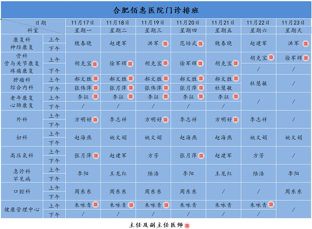 為方便廣大市民了解合肥佰惠醫(yī)院門診醫(yī)師出診安排,現(xiàn)發(fā)布本周(11月17日-11月23日)門診醫(yī)師排班表,請(qǐng)大家合理安排就診時(shí)間。如遇停診、換診等特殊情況有所調(diào)整,以當(dāng)日出診安排為準(zhǔn),造成不便敬請(qǐng)諒解!