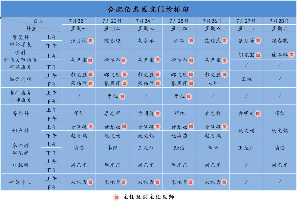 為方便廣大市民了解合肥佰惠醫(yī)院門診醫(yī)師出診安排,現(xiàn)發(fā)布下周(7月22日-7月28日)門診醫(yī)師排班表,請大家合理安排就診時間。如遇停診、換診等特殊情況有所調(diào)整,以當日出診安排為準,造成不便敬請諒解!