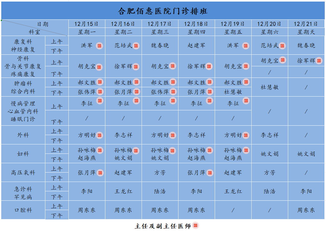 為方便廣大市民了解合肥佰惠醫(yī)院門診醫(yī)師出診安排,現(xiàn)發(fā)布本周(12月15日-12月21日)門診醫(yī)師排班表,請(qǐng)大家合理安排就診時(shí)間。如遇停診、換診等特殊情況有所調(diào)整,以當(dāng)日出診安排為準(zhǔn),造成不便敬請(qǐng)諒解!
